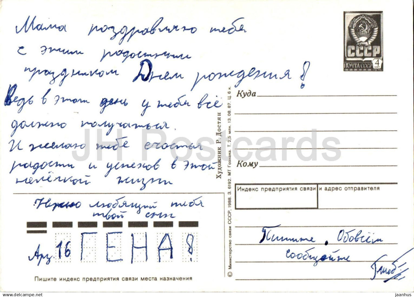 Carte de voeux d'anniversaire par R. Dostyan - Fleurs rouges - illustration - entier postal - 1988 - Russie URSS - utilisé