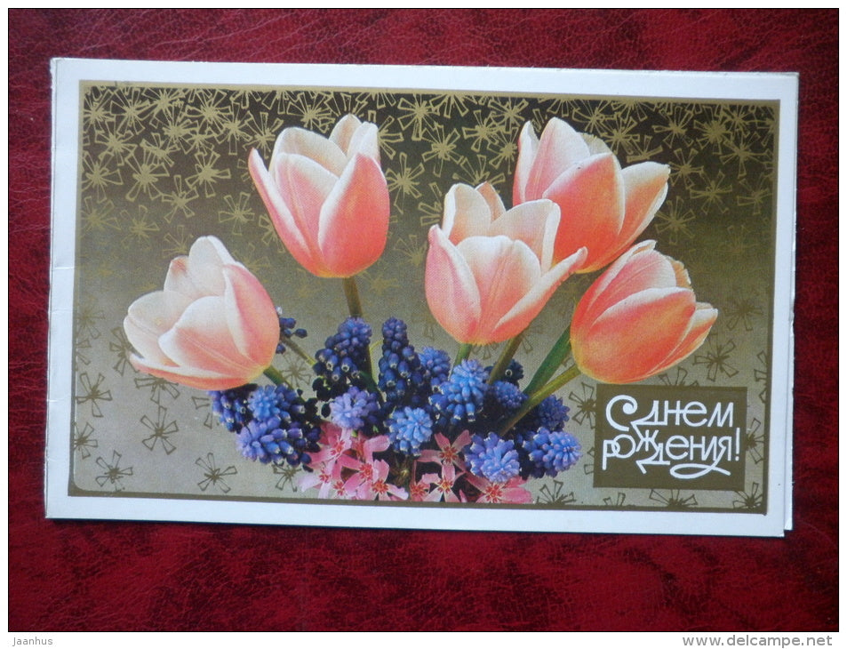 Carte de vœux d’anniversaire - tulipes - fleurs - 1986 - Russie - URSS - inutilisée