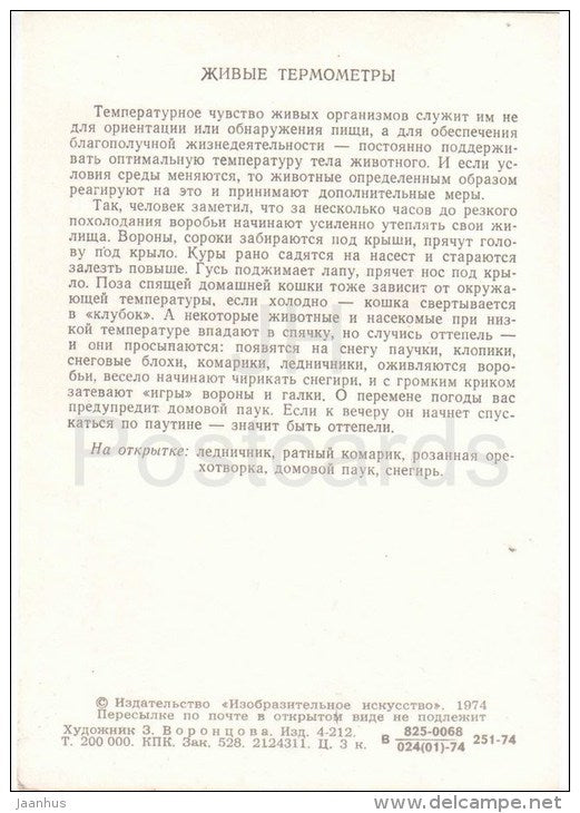 Bouvreuil - oiseaux - insectes - Thermomètres vivants - 1974 - Russie URSS - inutilisé