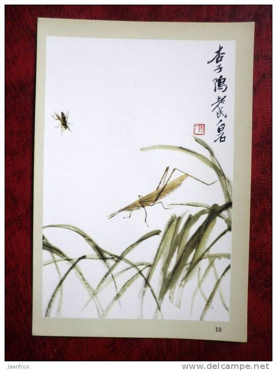 Art chinois - peinture de Chi Pai Shih - Sauterelle - insecte - imprimé sur papier fin - Russie - URSS - inutilisé