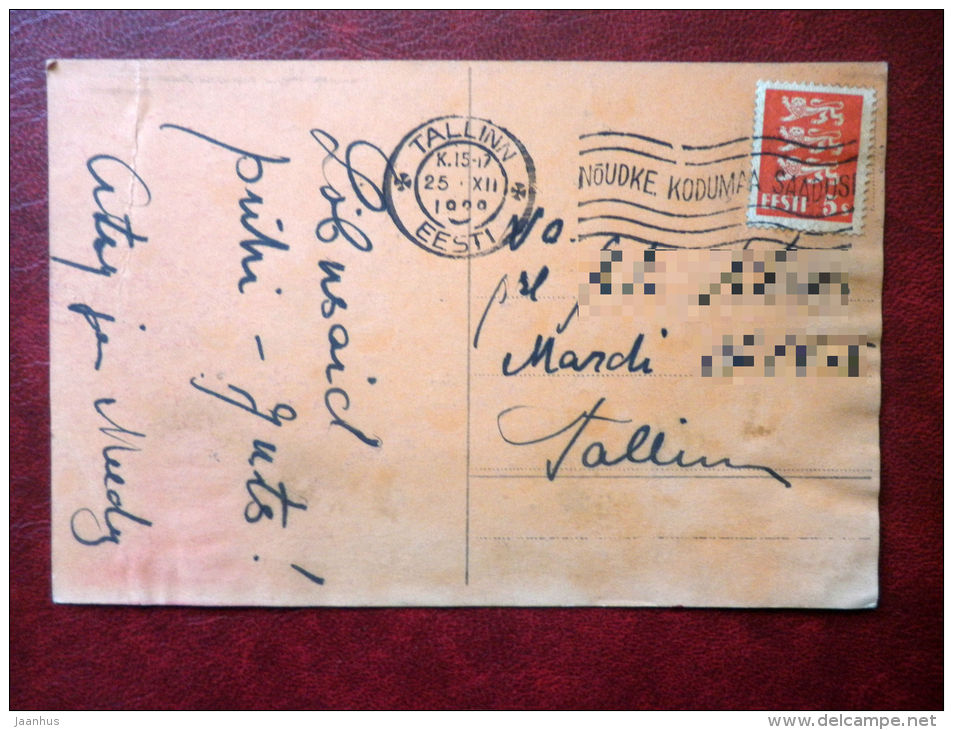 Carte de vœux de Noël - maison en hiver - coucher de soleil - diffusée en Estonie 1939, Tallinn - Estonie - utilisée