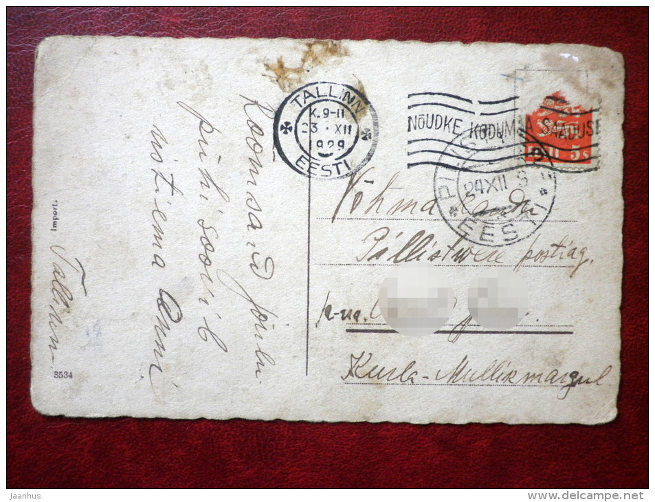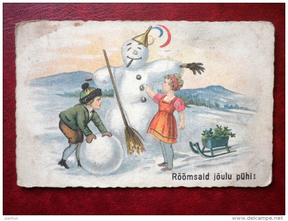 Carte de vœux de Noël - traîneau - bonhomme de neige - fille et garçon - 3534 - circulée en 1929 - Estonie - utilisée