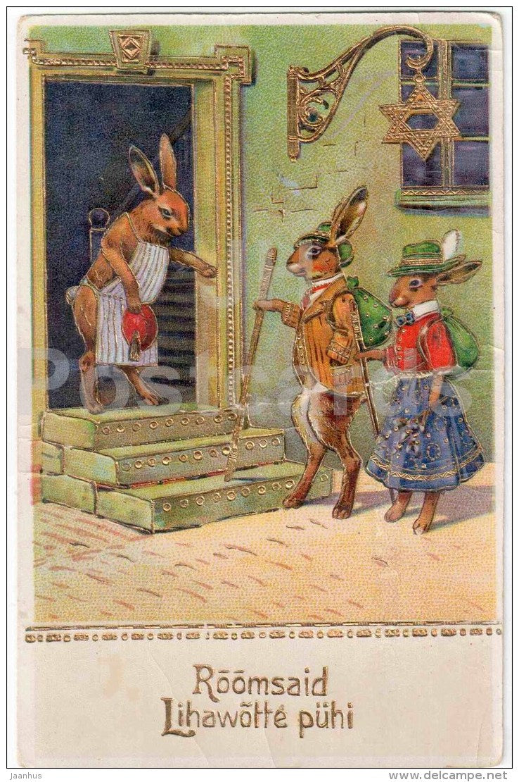 Carte de vœux de Pâques - lièvre - lapin - rue de la ville - HWB SER 2999 - diffusée en Estonie