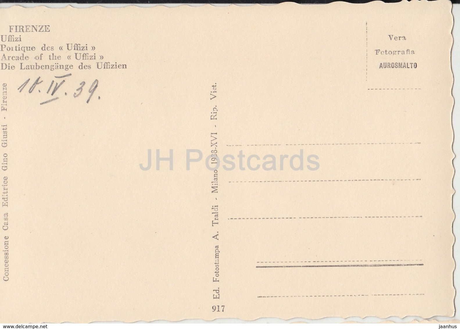 Firenze - Florence - Arcade des Offices - 917 - 1939 - carte postale ancienne - Italie - utilisé