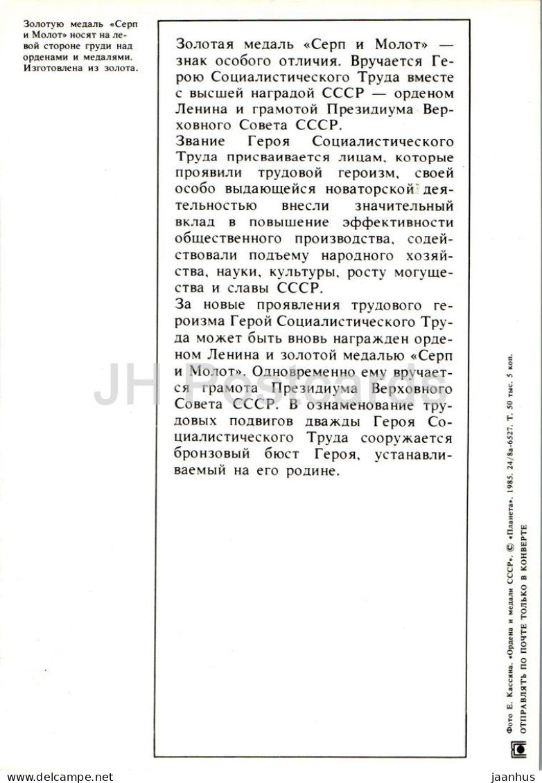 Médaille d'Or Marteau et Faucille - Ordres et Médailles de l'URSS - Carte Grand Format - 1985 - Russie URSS - inutilisée