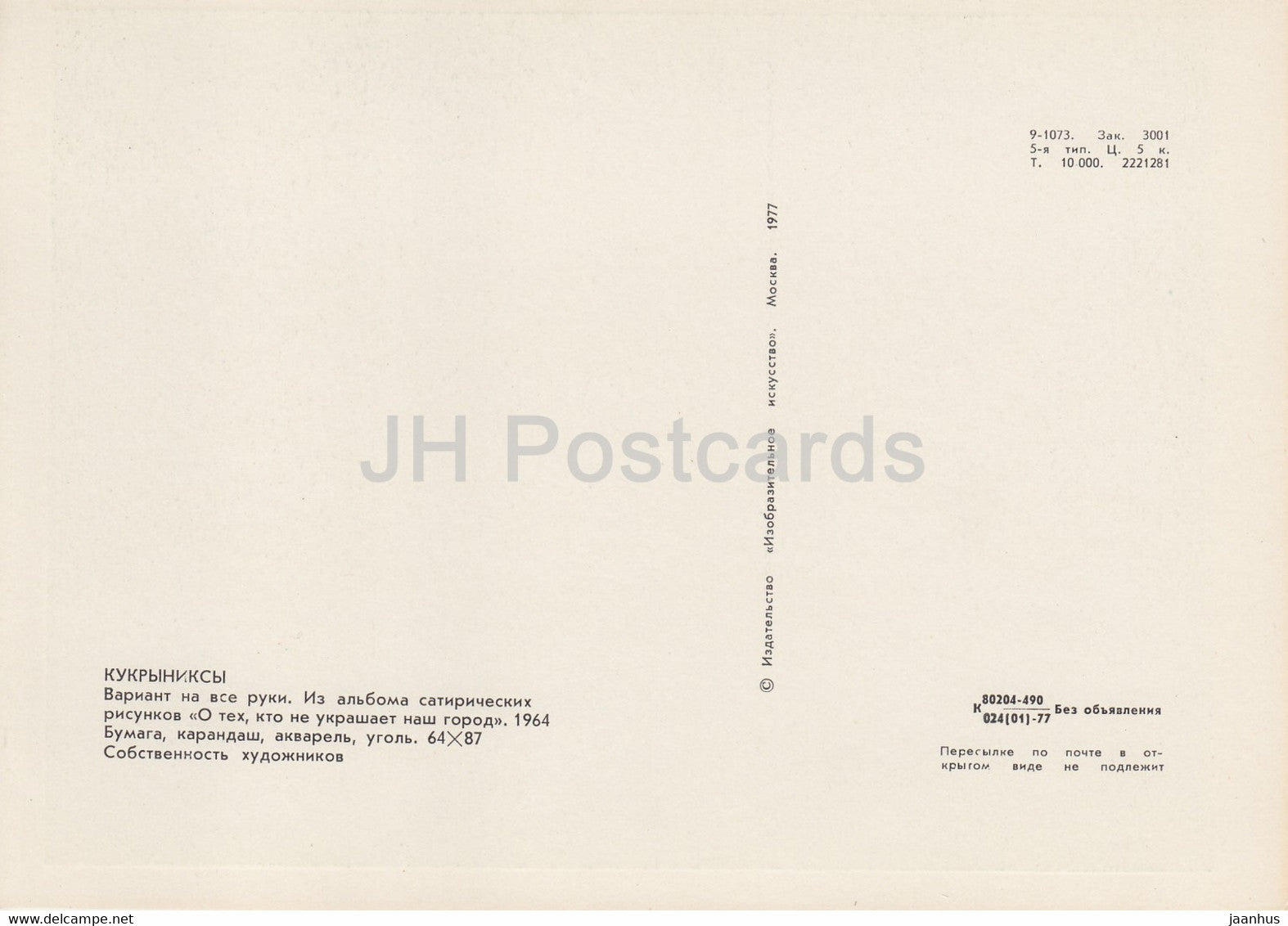 illustration de Kukryniksy - Touche-à-tout - carte grand format - 1977 - Russie URSS - inutilisée