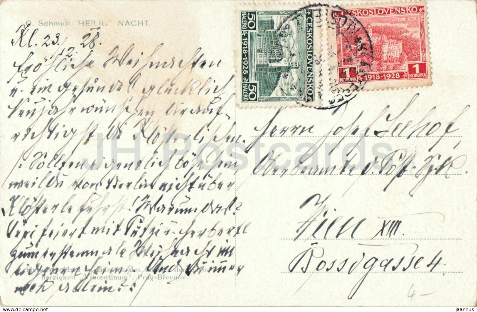 Illustration d'O. Schmidt - Sainte Nuit - carte postale ancienne - 1928 - République tchèque - utilisée