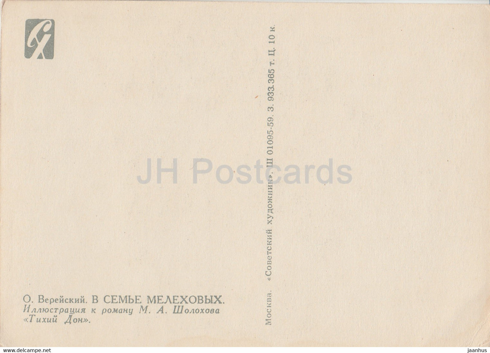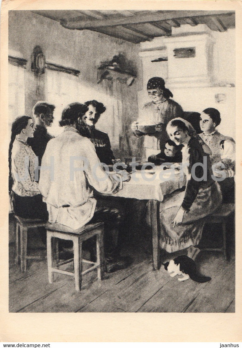 illustration de O. Vereysky - famille Melekhovo - chat - dîner - 1 And Quiet Flows the Don - 1959 - Russie URSS - inutilisé