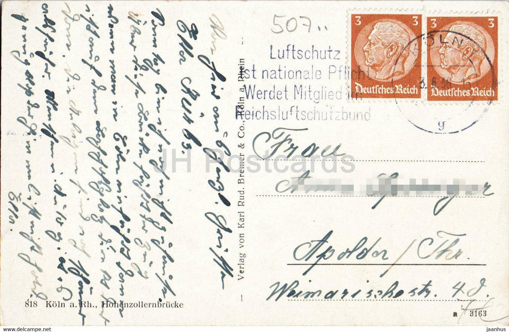 Koln a Rhein - Cologne - Hohenzollernbrucke - pont - 818 - 1936 - carte postale ancienne - Allemagne - utilisé