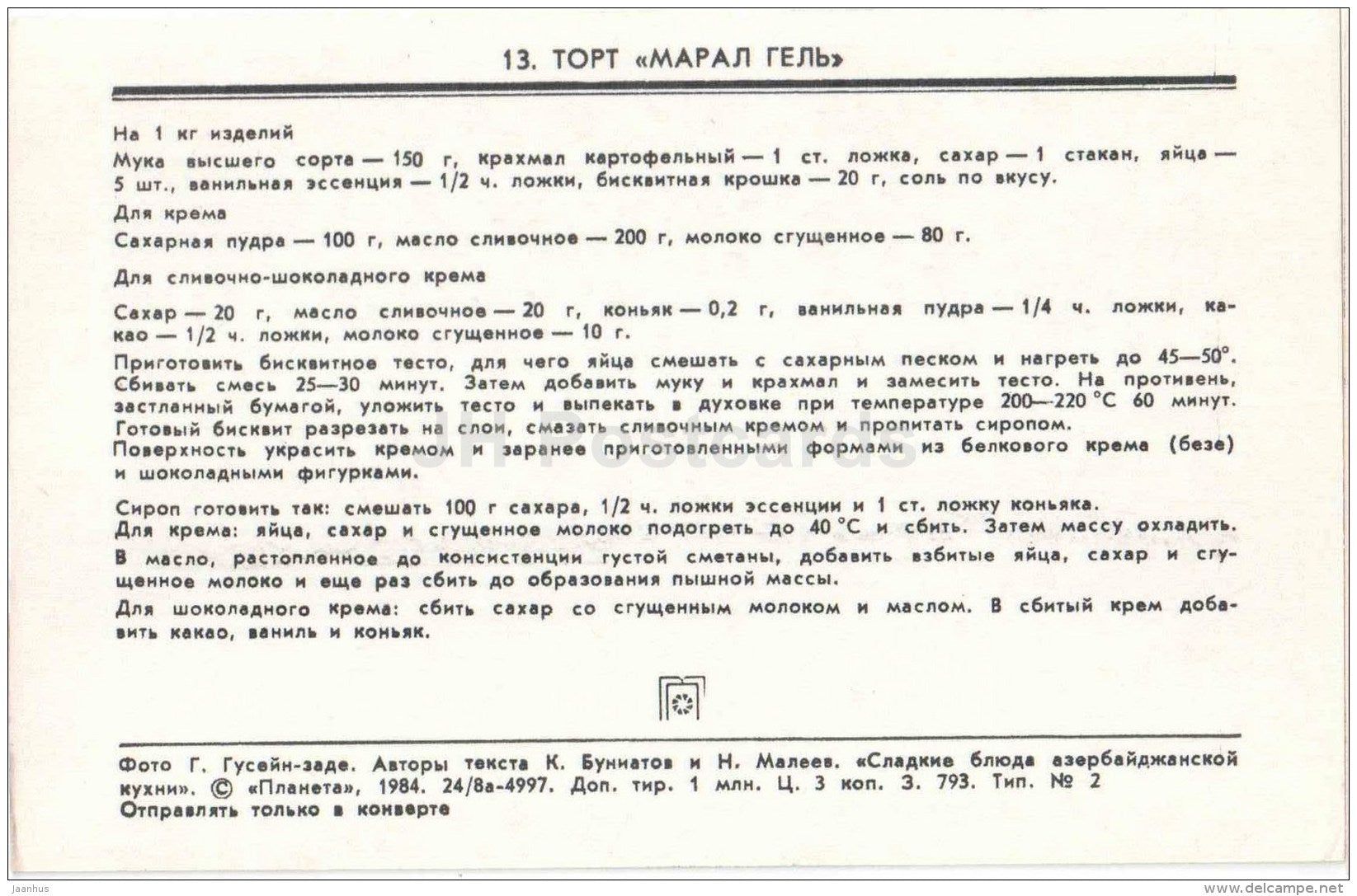 Gâteau Maral Gel - plats - dessert Azerbaïdjan - cuisine - 1984 - Russie URSS - inutilisé