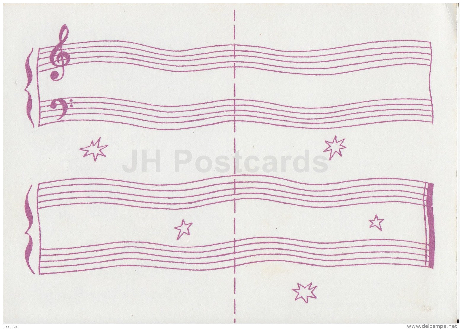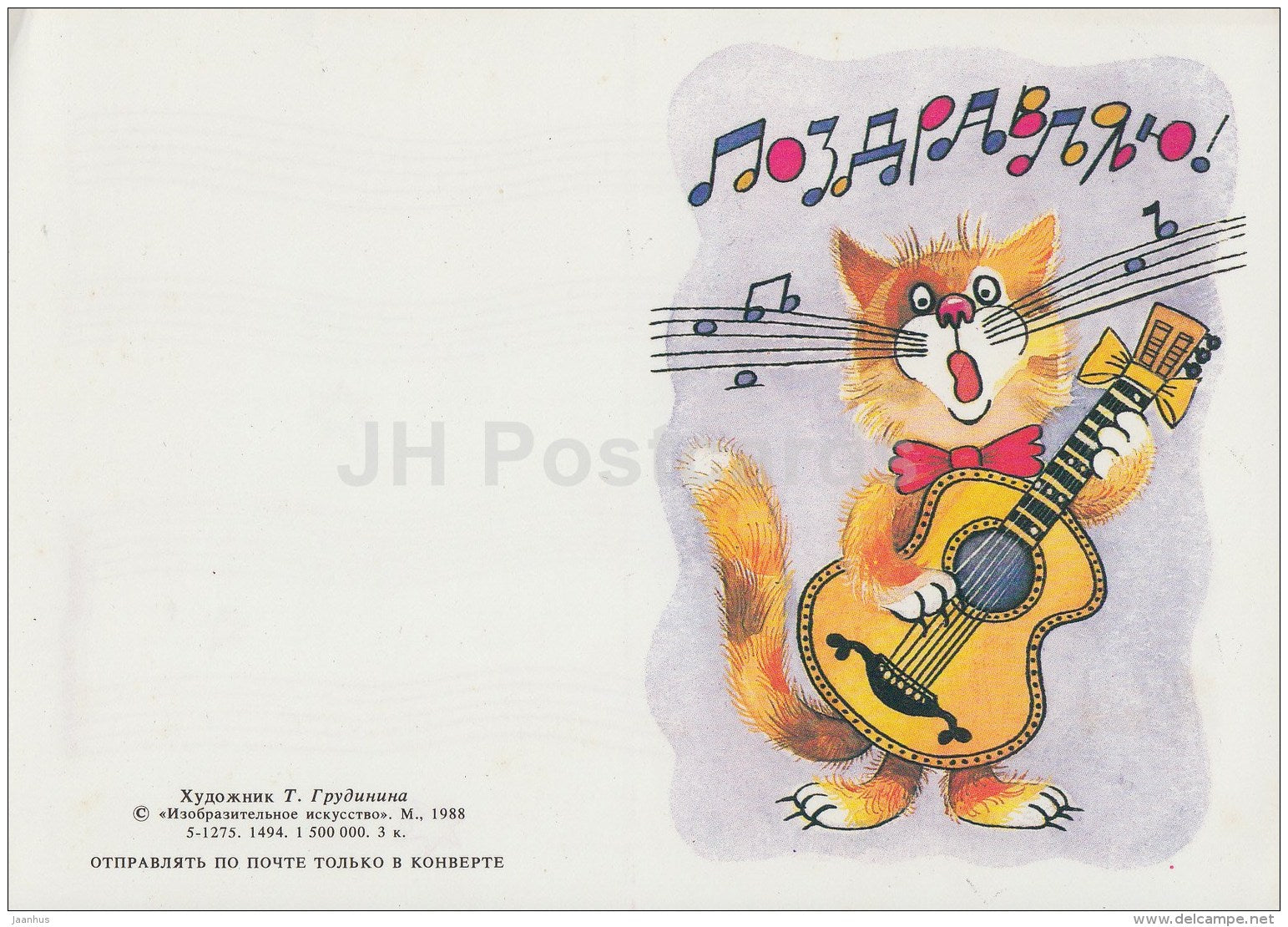 Mini Carte de vœux de T. Grudinina - chat chantant - guitare - 1988 - Russie URSS - inutilisée
