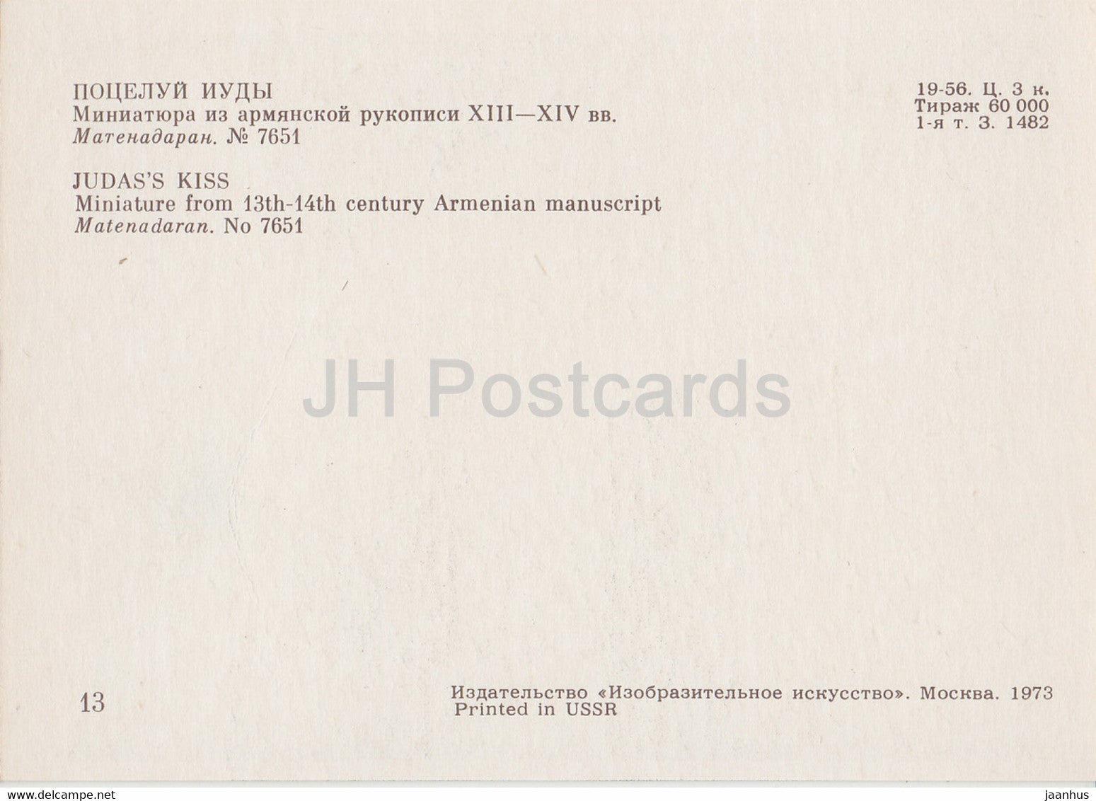 Miniatures dans les manuscrits arméniens - Judas Kiss - Matenadaran - Arménie - 1973 - Russie URSS - inutilisé