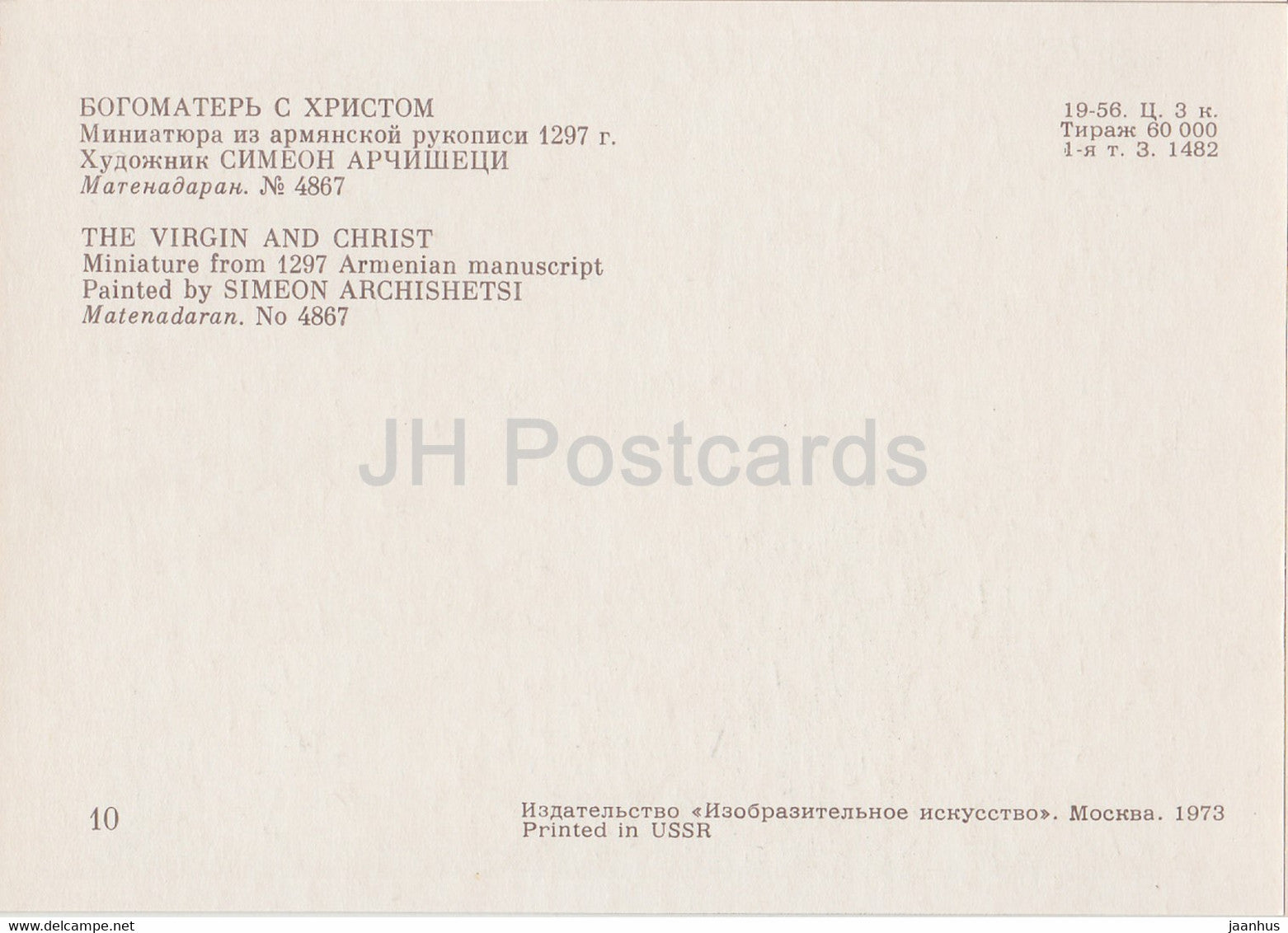 Miniatures dans les manuscrits arméniens - La Vierge et le Christ de Siméon Archishetsi - Arménie - 1973 - Russie URSS - inutilisé