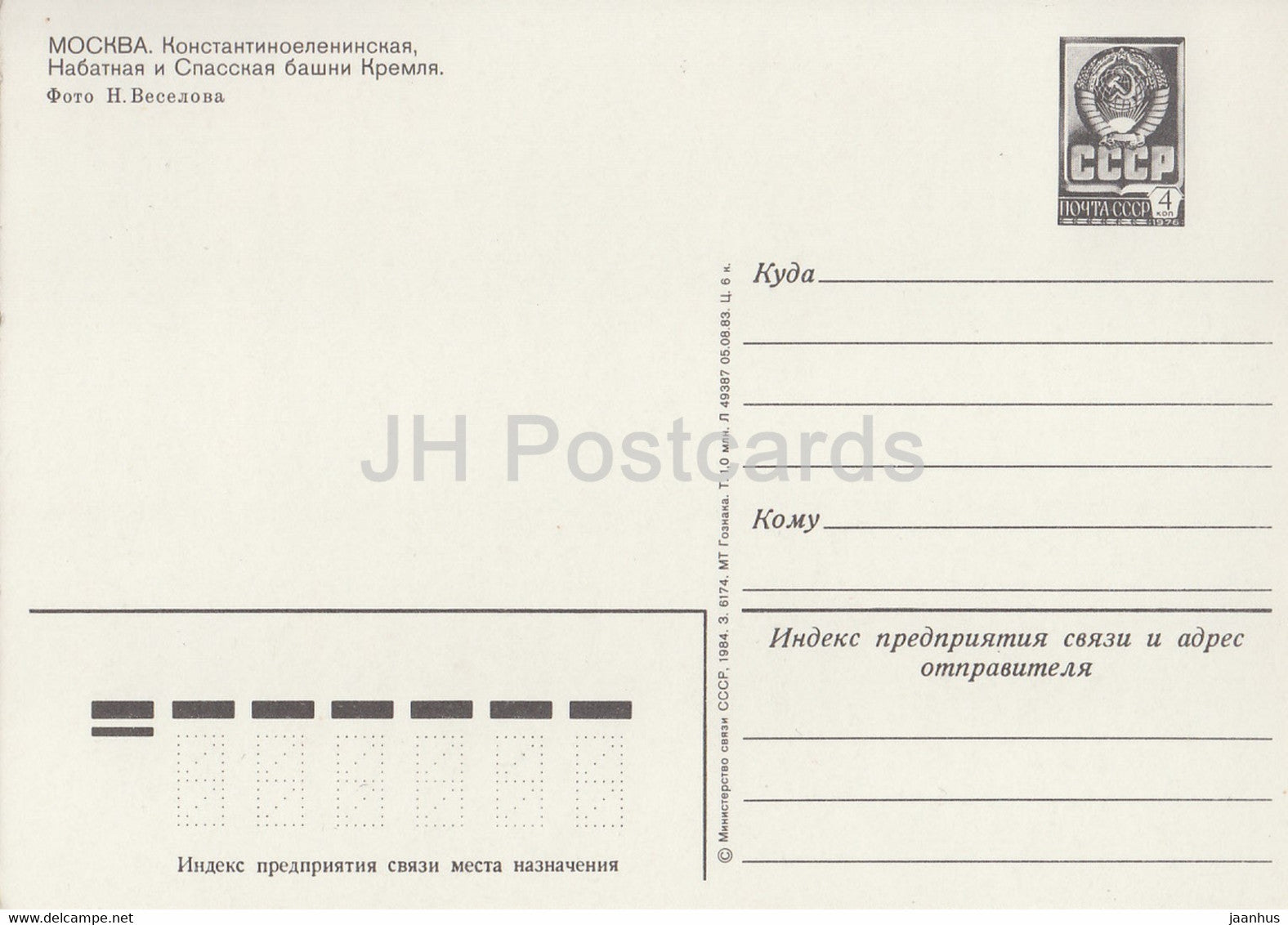 Moscou - Tour Konstantinoeleninskaya Nabatnaya Spasskaya - bus Ikarus - entier postal - 1984 - Russie URSS - inutilisé