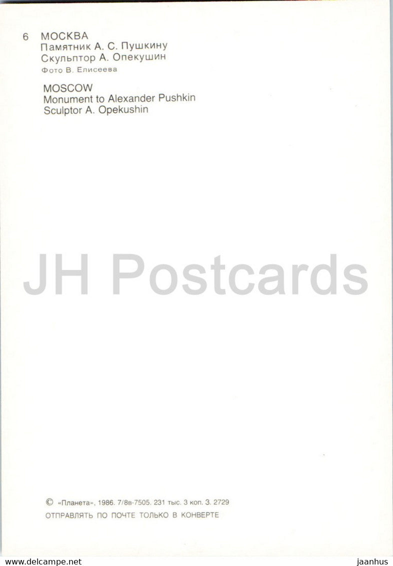 Moscou - monument au poète russe Pouchkine - 1986 - Russie URSS - inutilisé