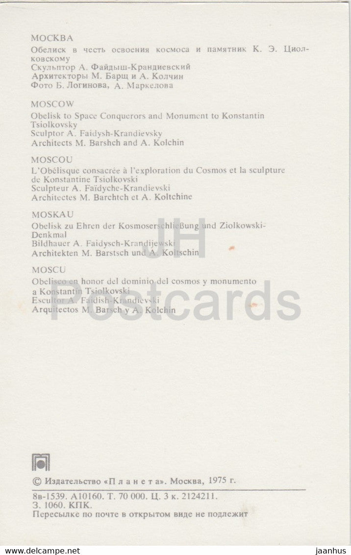 Moscou - Obelsik aux conquérants de l'espace et monument à Tsiolkovsky - 1975 - Russie URSS - inutilisé