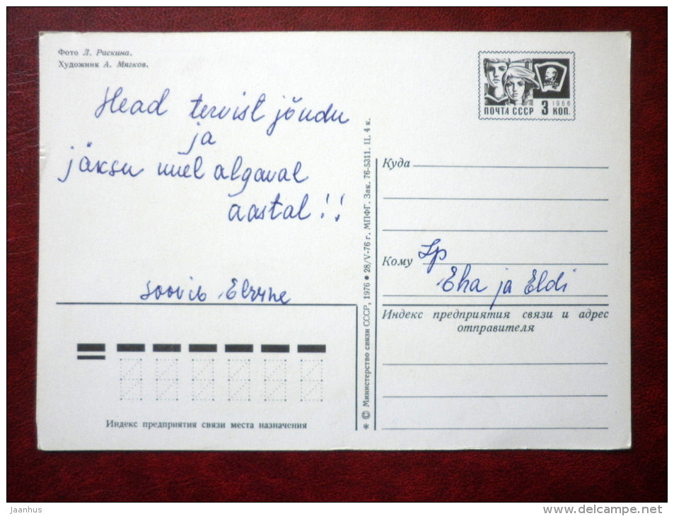Carte de vœux du Nouvel An - illustration de A. Myagkov - Père Noël - traîneau - chevaux - 1976 - Russie URSS - utilisé