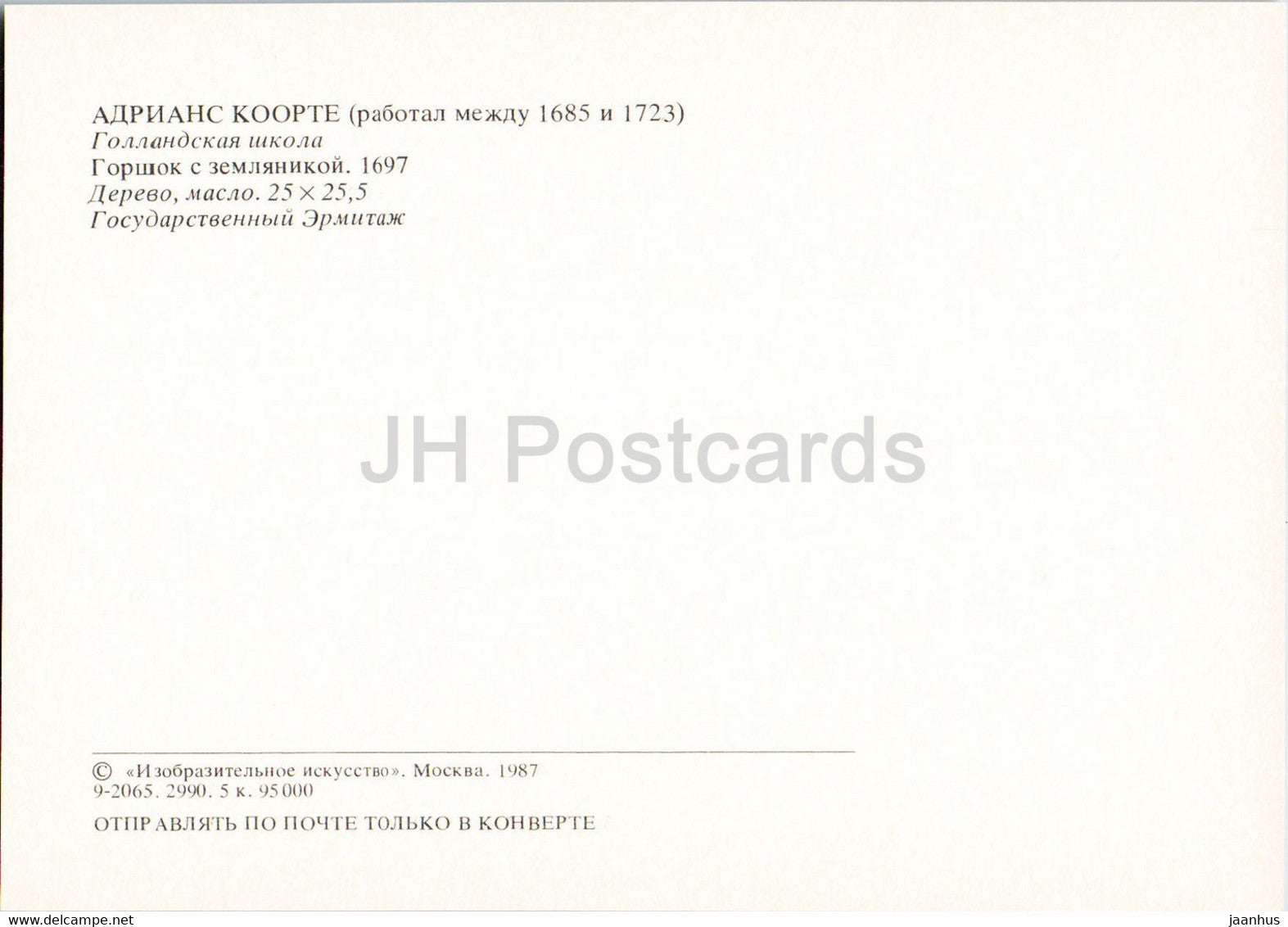 peinture d'Adriaen Coorte - Pot en argile avec fraises - Art néerlandais - 1987 - Russie URSS - inutilisé