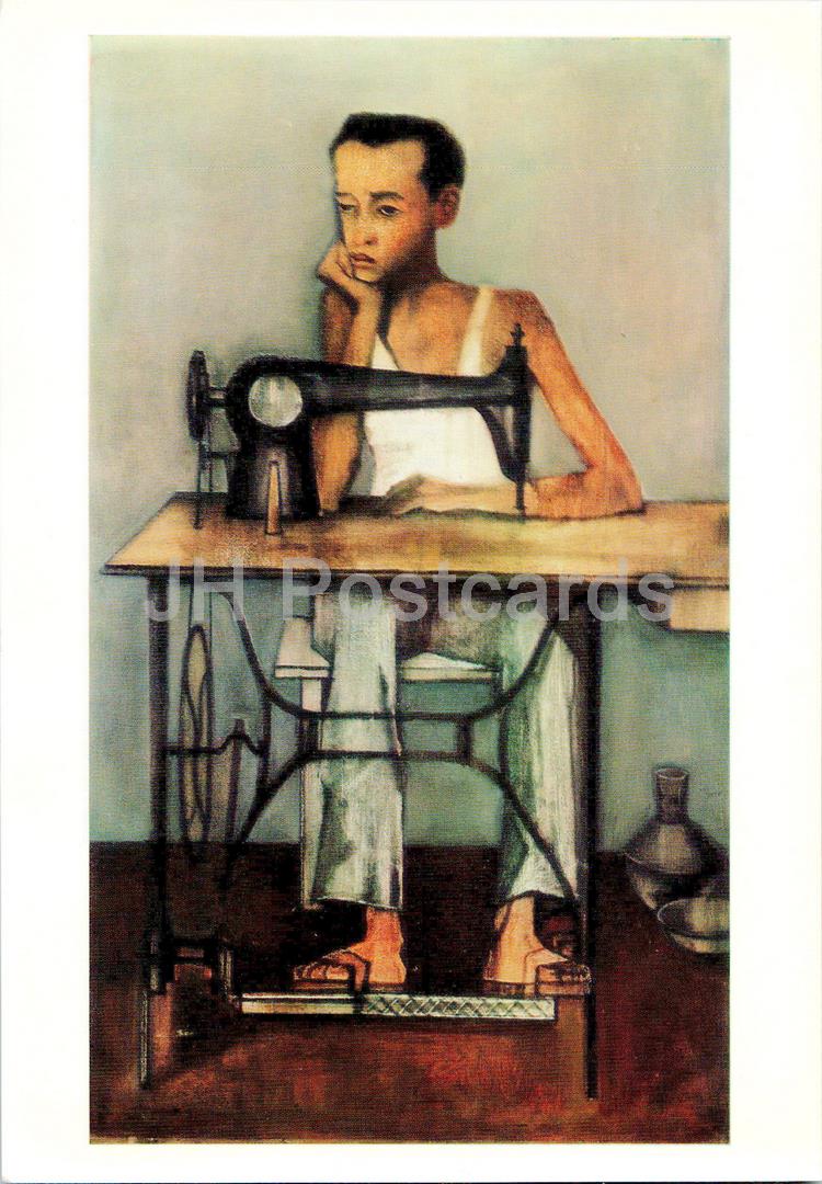 peinture de Hakob Hakobian - Tailleur - machine à coudre - Art arménien - Carte grand format - 1975 - Russie URSS - inutilisé