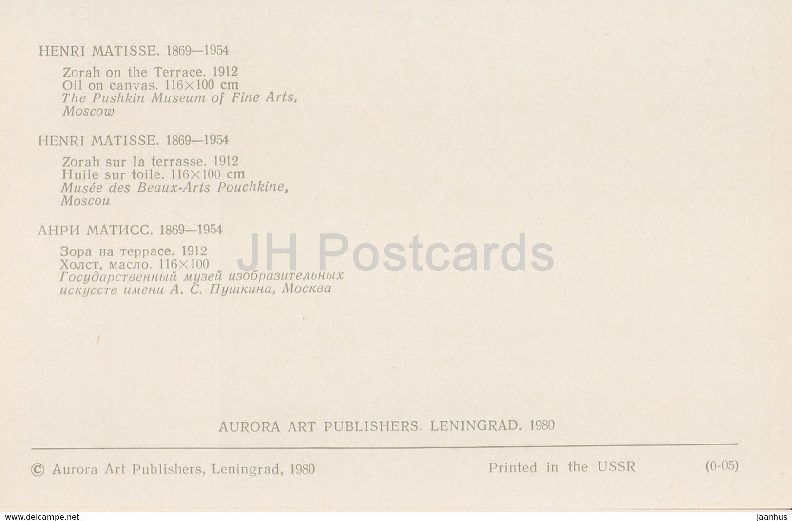 tableau d'Henri Matisse - Zorah sur la terrasse - Art français - 1980 - Russie URSS - inutilisé