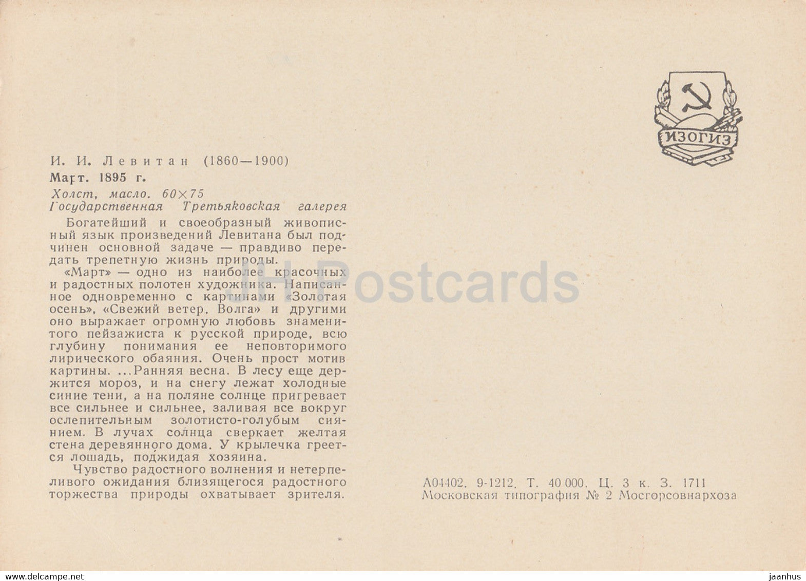 peinture de I. Levitan - Mois de mars - Art russe - Russie URSS - inutilisé