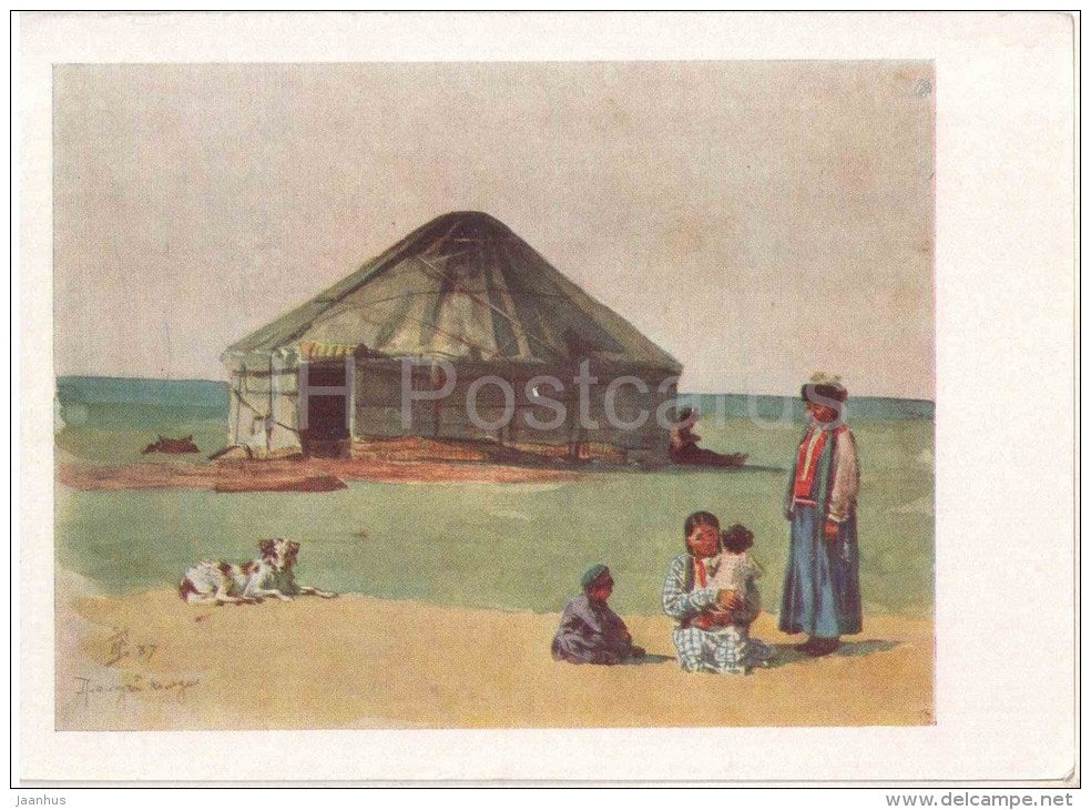 peinture de I. Pryanishnikov - Près de la tente, 1887 - Mongolie - chien - art russe - inutilisé