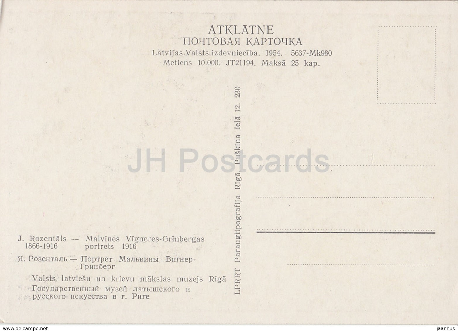 tableau de J. Rozentals - Portrait de Malvina VIGNERE-GRINBERGA - Art letton - 1954 - Lettonie URSS - utilisé
