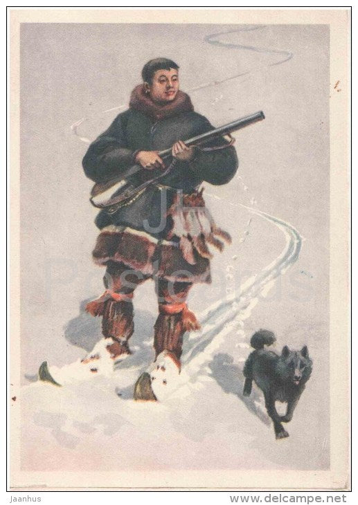 peinture de V. Trofimov - Chasseur - ski - chien - fusil - art russe - inutilisé
