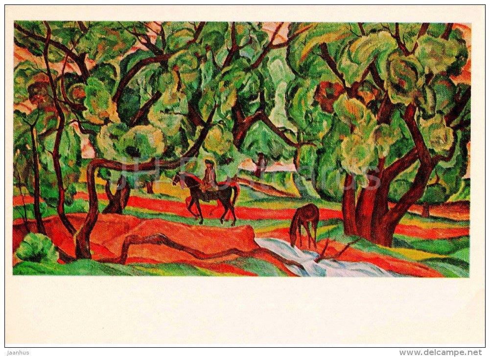 peinture de Y. Bayramov - Une scène paisible, 1969 - chevaux - art turkmène - inutilisé