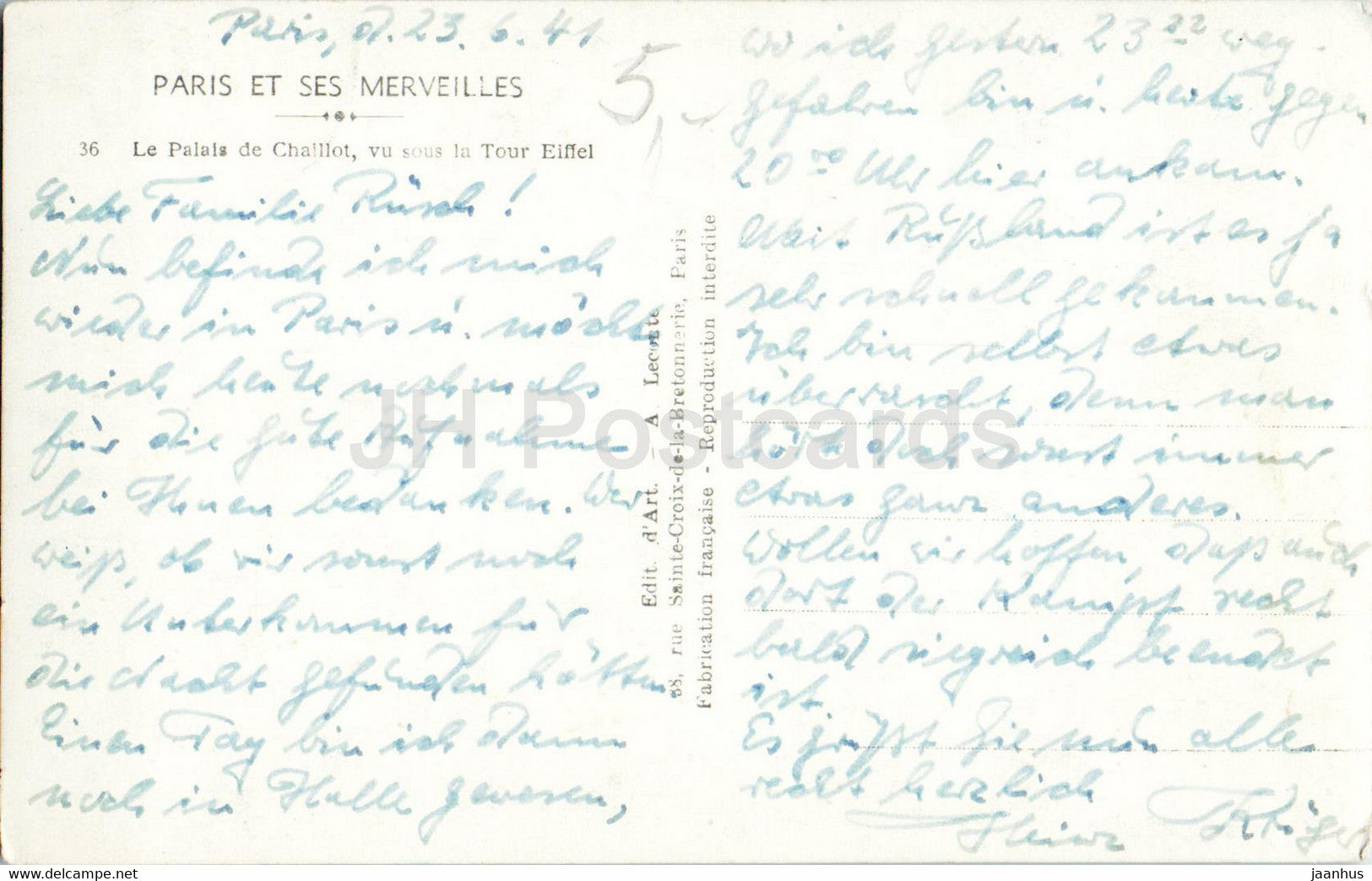 Paris - Le Palais de Chaillot vu sous la Tour Eiffel - 36 - carte postale ancienne - 1941 - France - occasion