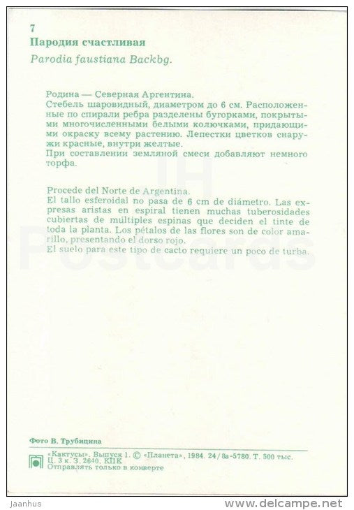 Parodia faustiana - cactus - fleurs - 1984 - Russie URSS - inutilisé