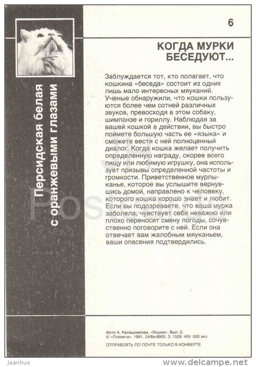 Chat blanc persan aux yeux orange - Chat - 1991 - Russie URSS - inutilisé