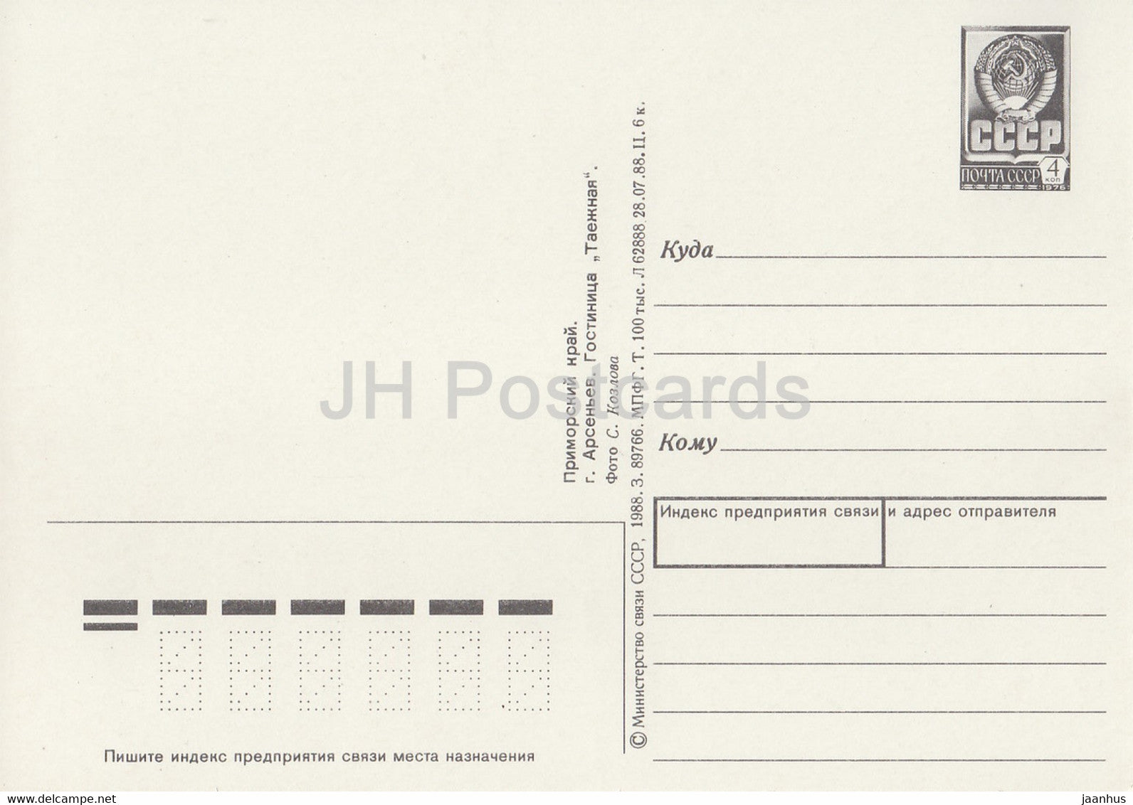 Primorsky Krai - Arsenyev - hôtel Tayezhnaya (Taïga) - entier postal - 1988 - Russie URSS - inutilisé