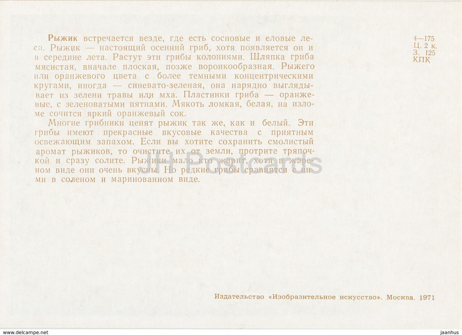 Bouchon de lait au safran - champignons - illustration - 1971 - Russie URSS - inutilisé