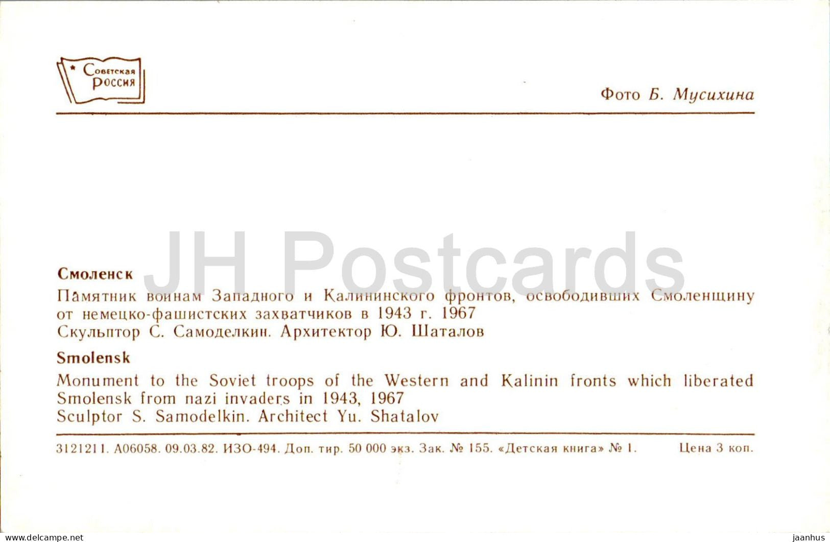 Smolensk - monument aux troupes soviétiques des fronts occidental et Kalinin - militaire - 1982 - Russie URSS - inutilisé