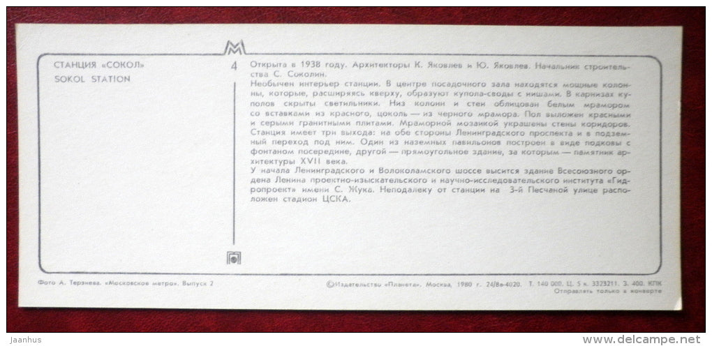 Station Sokol - Métro de Moscou - métro - Moscou - 1980 - Russie URSS - inutilisé