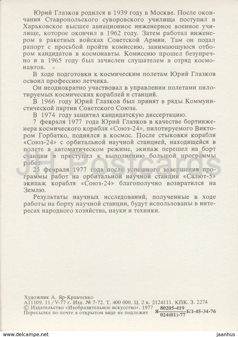 Cosmonaute soviétique Yuri Glazkov - espace - 1977 - Russie URSS - inutilisé