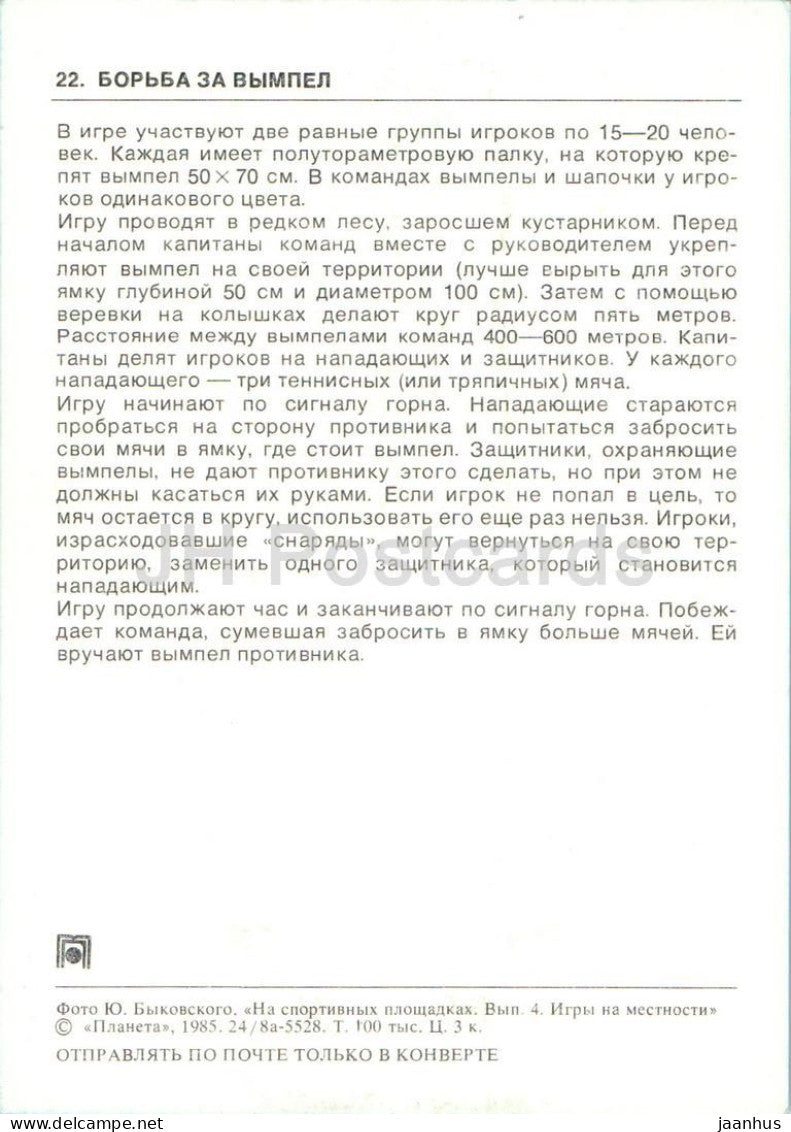 Lutte pour le fanion - Jeux de plein air - Carte de jeu de camping et de sport de pionniers - Enfants - 1985 - Russie URSS - Non utilisée