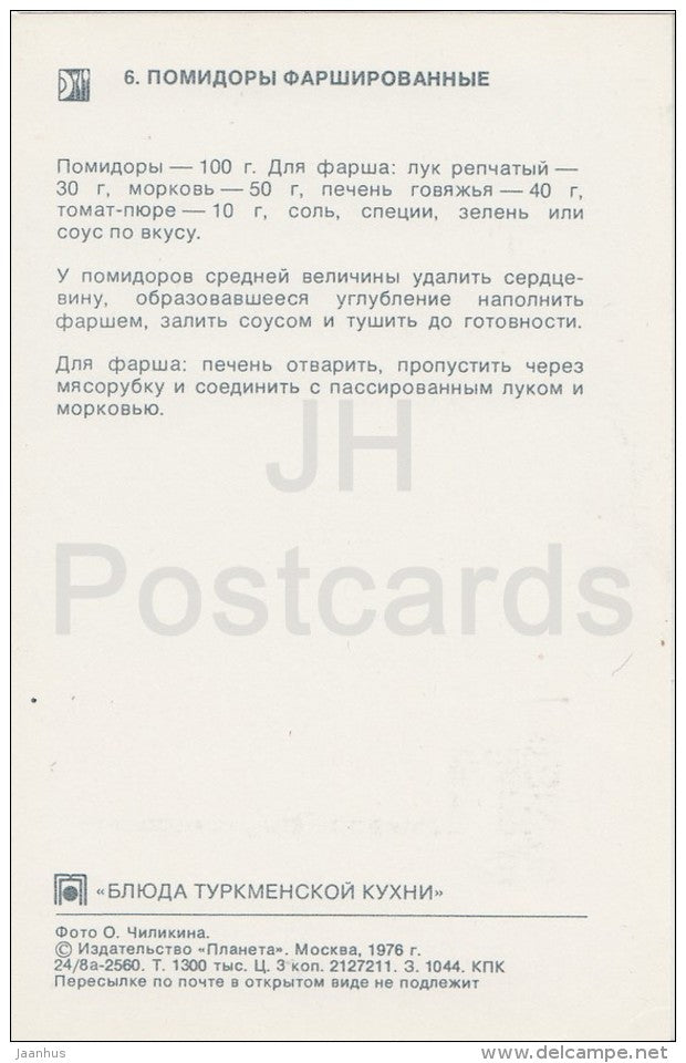 Tomates farcies - Plats du Turkménistan - Cuisine - 1976 - Russie URSS - inutilisé