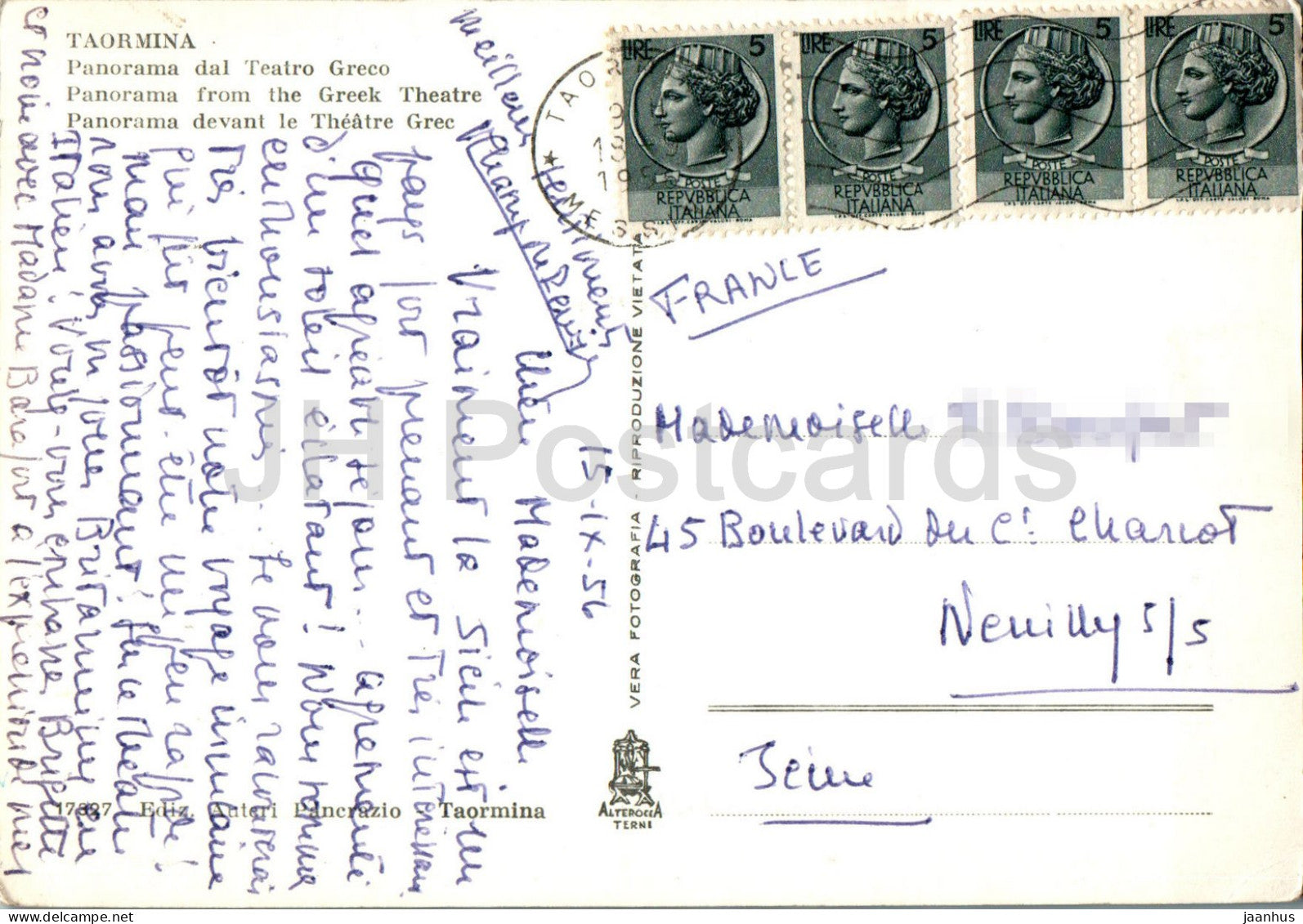 Taormina - Panorama dal Teatro Greco - Panorama du théâtre grec - monde antique - carte postale ancienne - 1956 - Italie - utilisé
