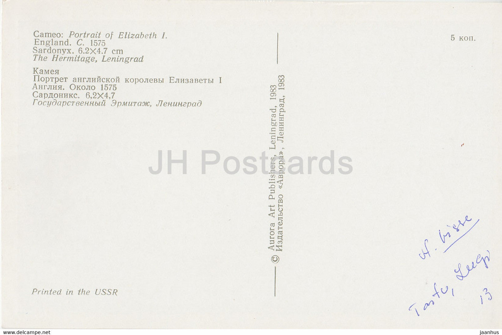 L'Ermitage, Leningrad, Art appliqué anglais - Camée. Portrait d'Elizabeth I. 1575 - Russie - URSS - 1983 - utilisé