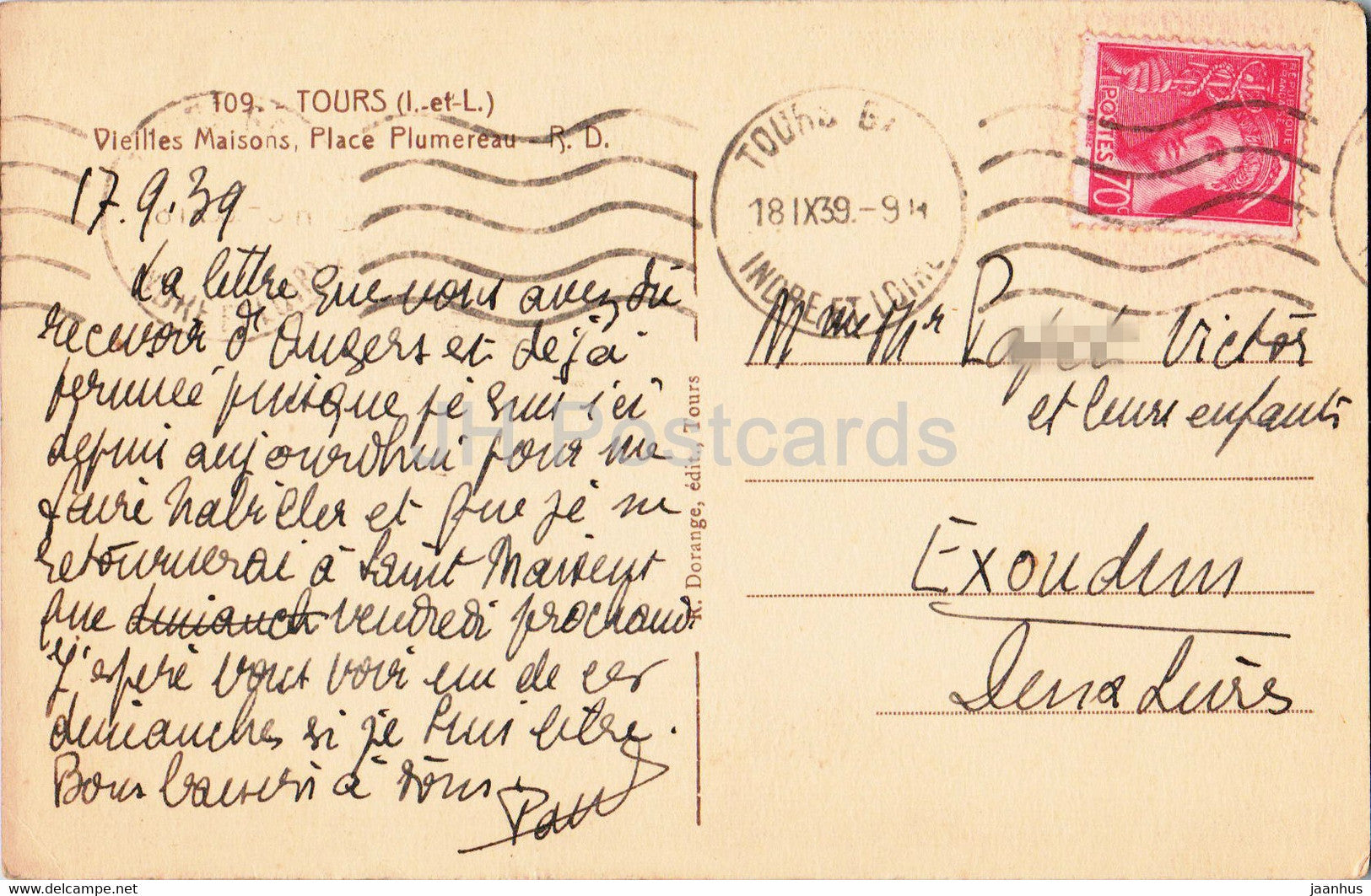 Tours - Vieilles Maisons - Place Plumerau - 109 - carte postale ancienne - 1939 - France - occasion