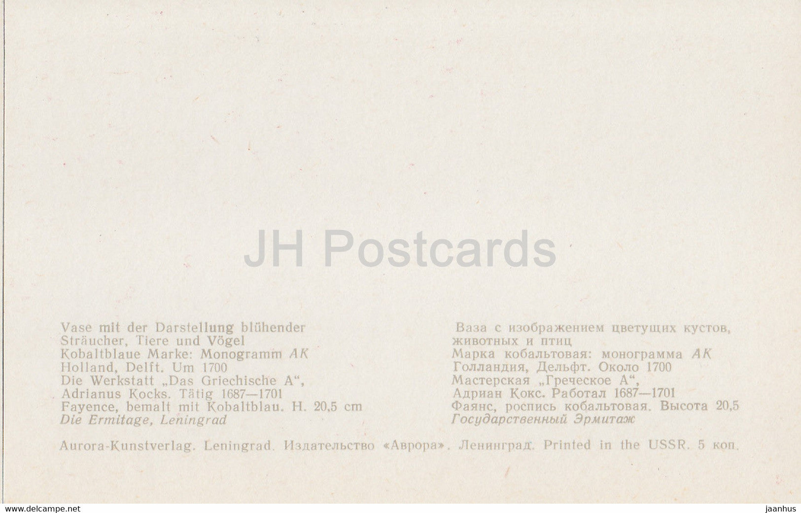 Vase avec arbustes à fleurs, animaux et oiseaux par Adrianus Kocks - 1 - Faïence - Delftware - 1974 - Russie URSS - inutilisé