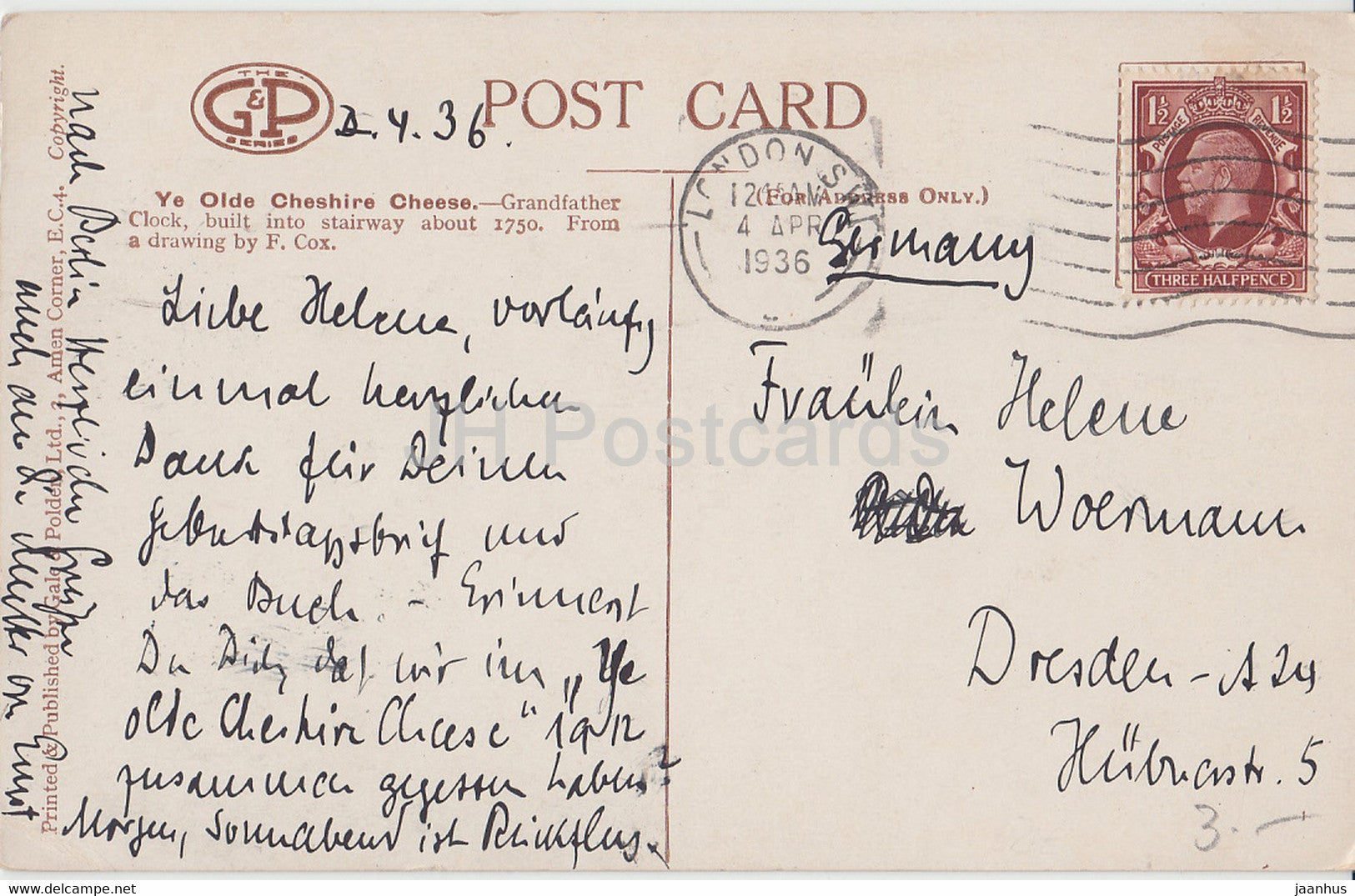 Ye Olde Cheshire Cheese - Grandfather Clock - dessin de F. Cox - carte postale ancienne - Angleterre - 1936 - Royaume-Uni - utilisé