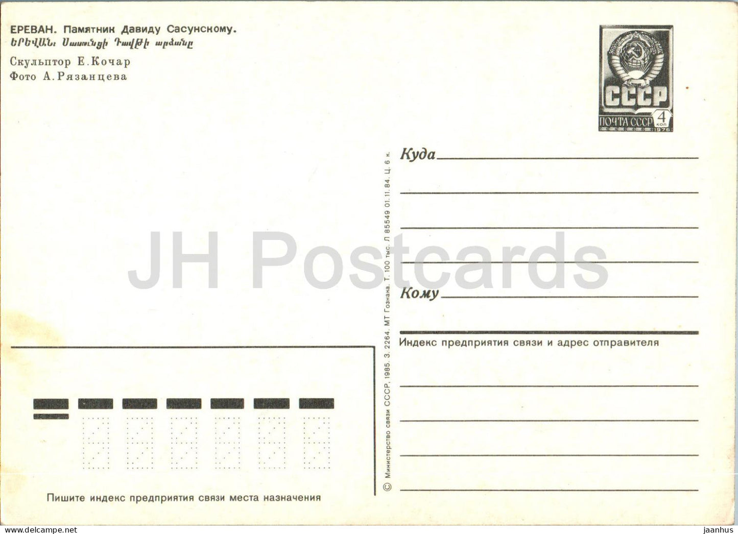 Erevan - Monument David de Sasun - entier postal - 1985 - Arménie URSS - inutilisé