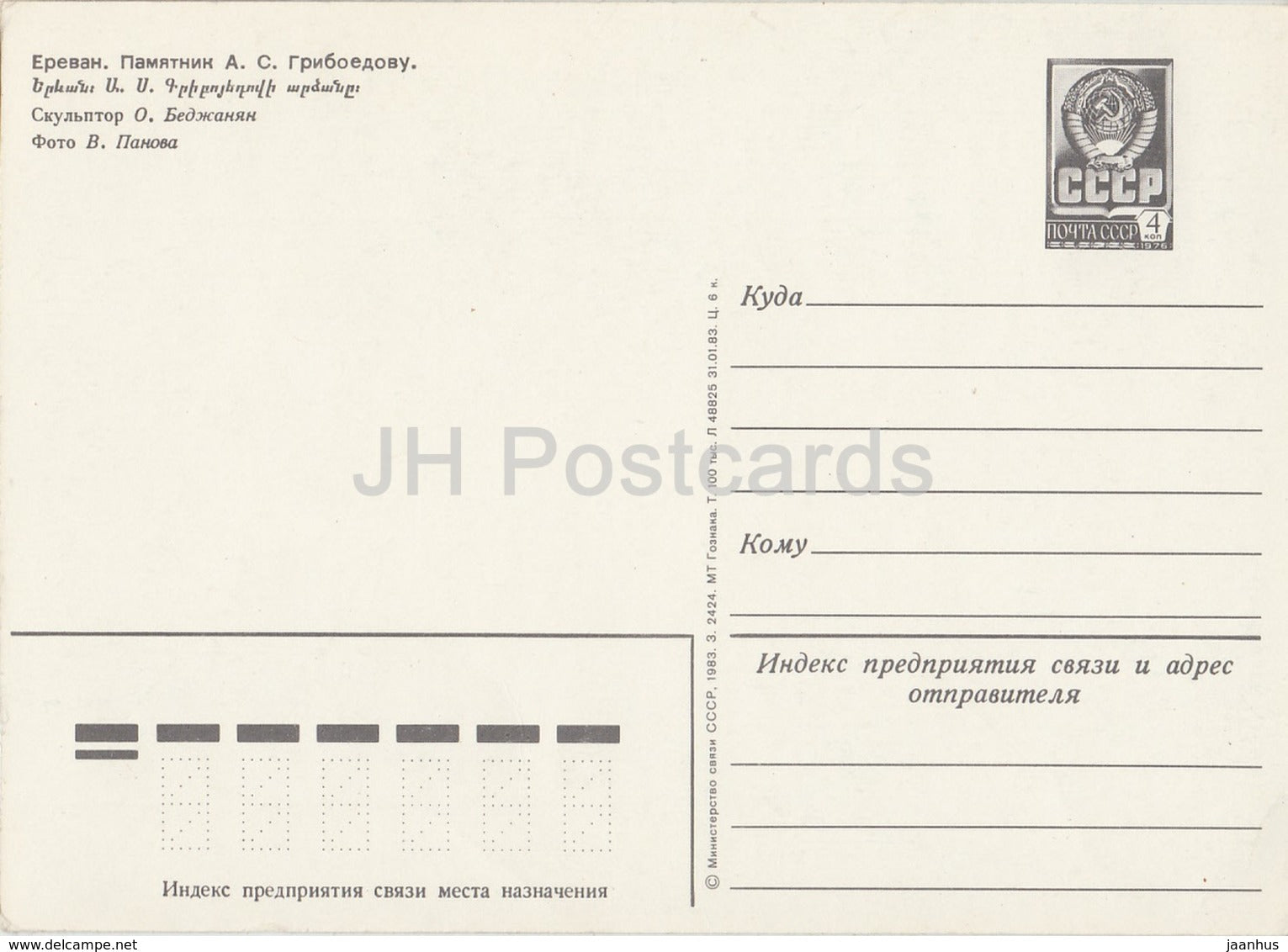Erevan - monument à l'écrivain russe Griboïedov - tramway - entier postal - 1983 - Arménie URSS - inutilisé