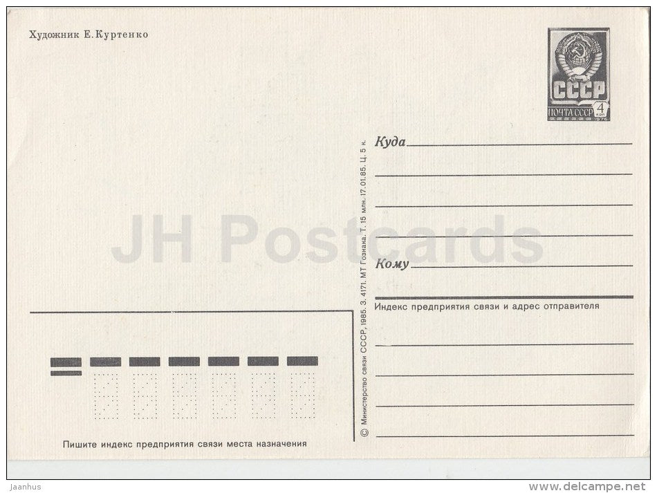 8th March greeting card by Y. Kurtenko - Lily of the valley - Blue Flowers - 1985 - Russia USSR - unused