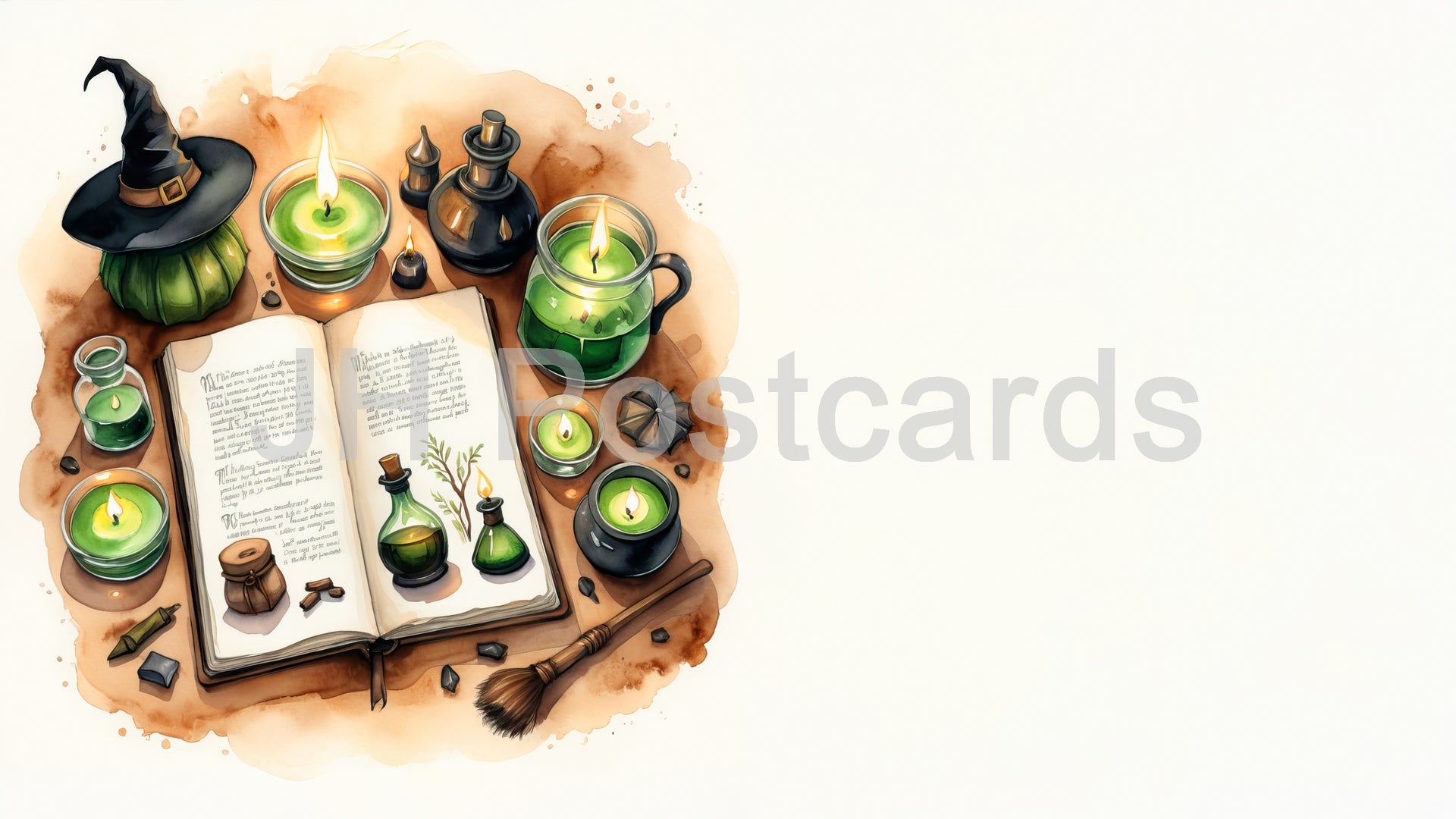 AI Image - A captivating watercolor painting of a witch's workspace, featuring a spellbook, candles, potions, and other magical tools. Halloween. Drawing. Art. Illustration. Copy Space.