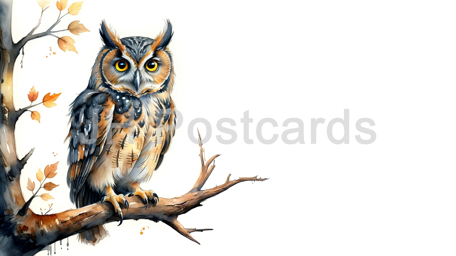 AI Image - A dramatic watercolor painting of an owl perched on a branch, bathed in the soft glow of moonlight. Halloween. Drawing. Art. Illustration. Copy Space. 4