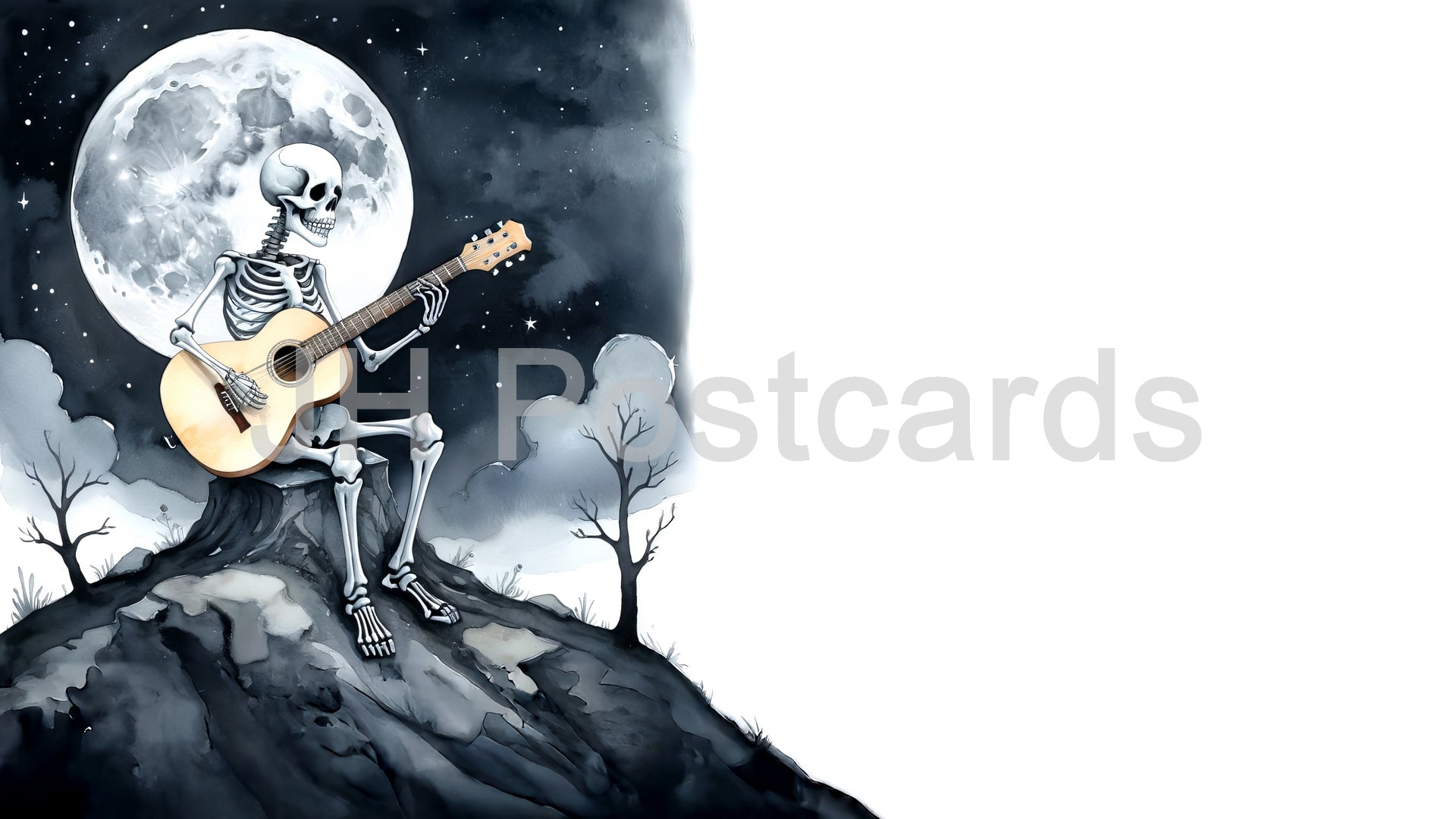 AI Image - A skeletal musician sits atop a rock under the full moon, strumming an acoustic guitar in a surreal, eerie scene. Halloween. Drawing. Art. Illustration. Copy Space. 1